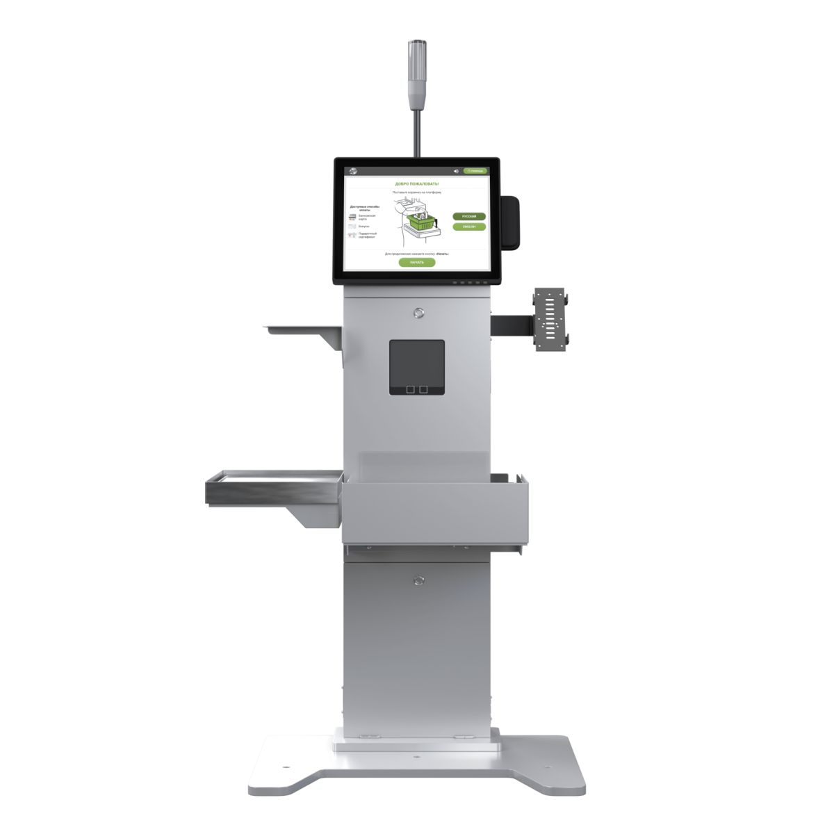 В комплекте: полка для корзины, платформа для взвешивания и система оповещения.